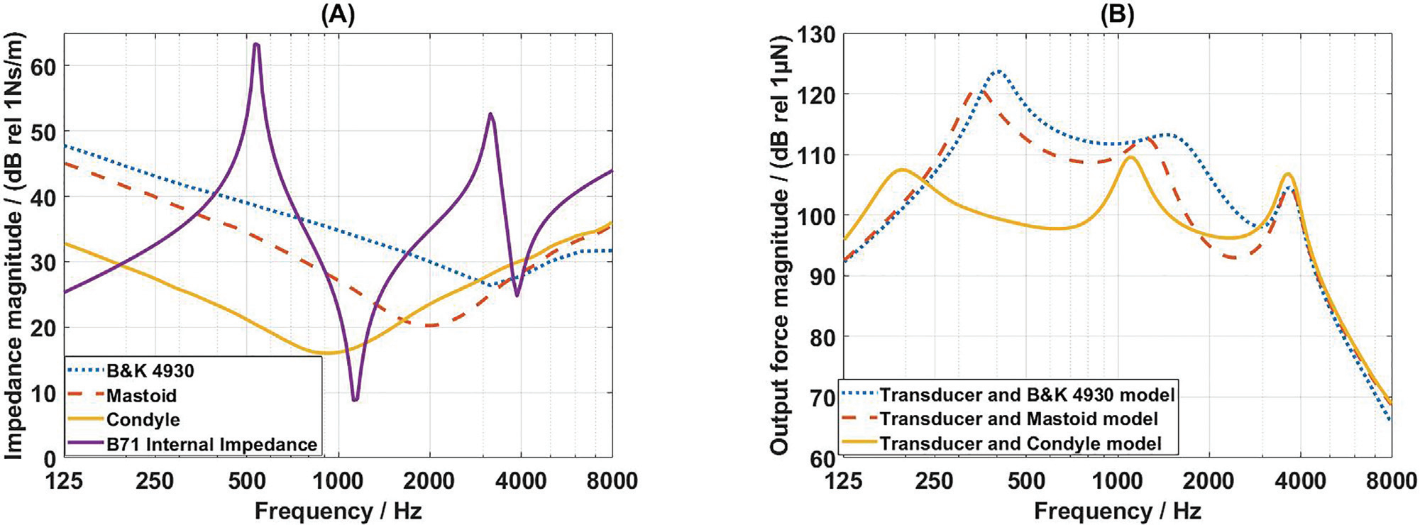 图6 (A)实际测量的乳突力阻抗、髁突力阻抗、以及人工乳突模拟器B&K 4930的力阻抗。(B)骨传导器件电力类比模型耦合人工乳突模拟器B&K 4930力阻抗、乳突力阻抗和髁突力阻抗时的输出力。(图/中科院声学所)