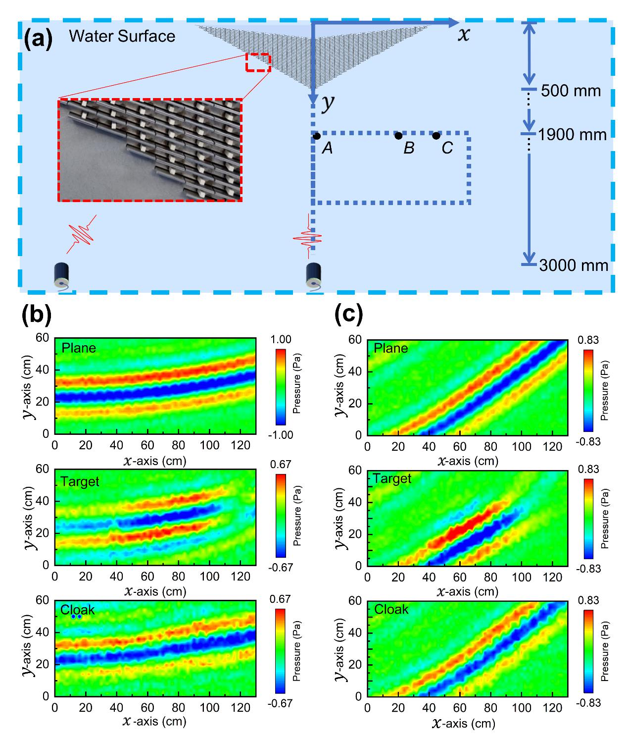 该研究团队通过在水中周期性地交替排列合成泡沫条和钢条,构建了二维水下隐身毯,并在消声水池中进行了宽频和斜入射的实验验证。实验结果表明,这种隐身毯在宽频和斜入射下都表现出了优异的隐身性能。该隐身毯采用材料参数和结构协同设计的方式,大大拓宽了超材料所能实现的声学参数范围,也为协同调控的超材料器件的实现提供了一个典型的例子,为水声器件的实际工程应用奠定了基础。