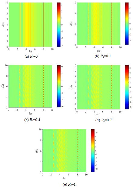 图2 不同声压反射系数下水中聚乙烯柱壳的声辐射力矩随无量纲频率ka和距离d/a的变化关系(图/中科院声学所)