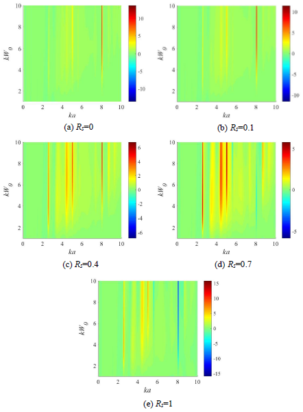 图3 不同声压反射系数下水中聚乙烯柱壳的声辐射力矩随无量纲频率ka和束腰半径的变化关系(图/中科院声学所)