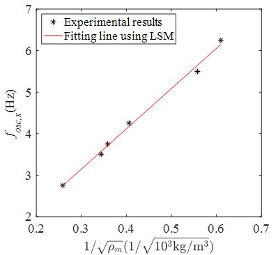 当小球偏离声轴时会受到声场施加的横向回复力作用。若偏轴距离较小,则这一回复力作用与偏轴距离成正比,从而使得小球在水平面内作简谐运动。根据理论计算结果,横向振动频率反比于小球密度的平方根。实验结果表明,在误差允许的范围内,这六种小球的横向振动频率近似与密度平方根的倒数成线性关系,该结果与理论预测关系相符。该研究有利于通过驻波场声悬浮实现物性参数的非接触测量。