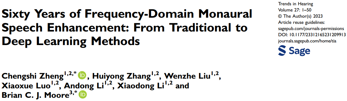 Zheng, C., Zhang, H., Liu, W., Luo, X., Li, A., Li, X., & Moore, B. C. (2023). Sixty years of frequency-domain monaural speech enhancement: From traditional to deep learning methods. Trends in Hearing, 27, 23312165231209913. DOI: 10.1177/23312165231209913