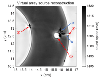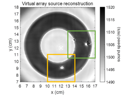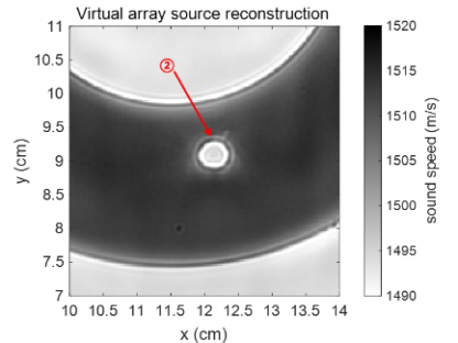 软组织体模的声速参数重建结果如图2所示,体模内外边缘清晰,尺寸和真实尺寸一致。一些已知特征也被成功重建,此外三点钟方向内部孔洞周围的一些破裂和小块脱落也在成像结果中清晰可见。该研究基于实验数据对软组织体模进行定量成像,分辨率可达亚毫米级。