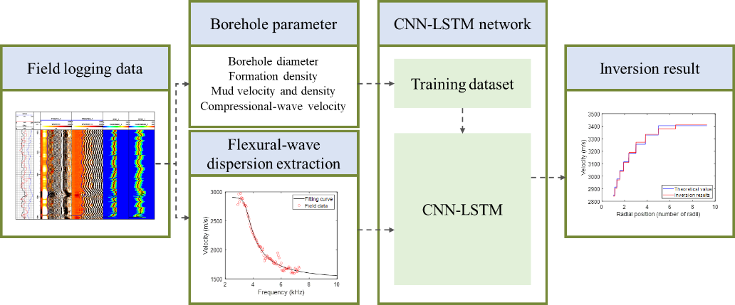 为此,中国科学院声学研究所超声学实验室博士生李嘉诚及其导师何晓研究员等基于偶极导波频散特征提出了一种使用分层模型评价地层横波速度径向变化的新方法,并使用卷积神经网络长短期记忆(Convolutional Neural Network Long Short-Term Memory, CNN-LSTM)模型加速反演过程。该方法可以准确定量评价由近井壁到远处地层的横波速度变化,且有效提高了反演效率。相关研究成果在线发表于学术期刊 IEEE Transactions on Geoscience and Remote Sensing(中国科学院期刊分区地学一区,IF = 8.2)。