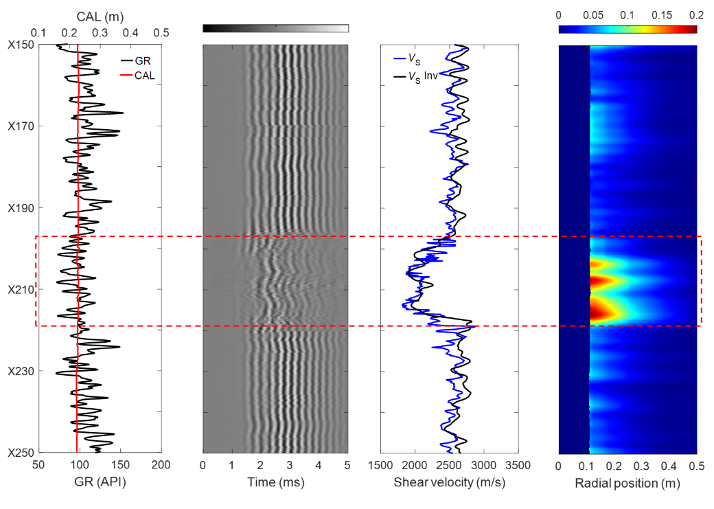 在地球物理测井过程中,钻井作业引发的岩石机械破碎以及泥浆入侵会致使井壁周围地层发生蚀变,进而造成地层横波速度出现径向变异。精确刻画地层的非均质特性对于定量评价岩石性质至关重要,并能为储层开发提供优化策略。