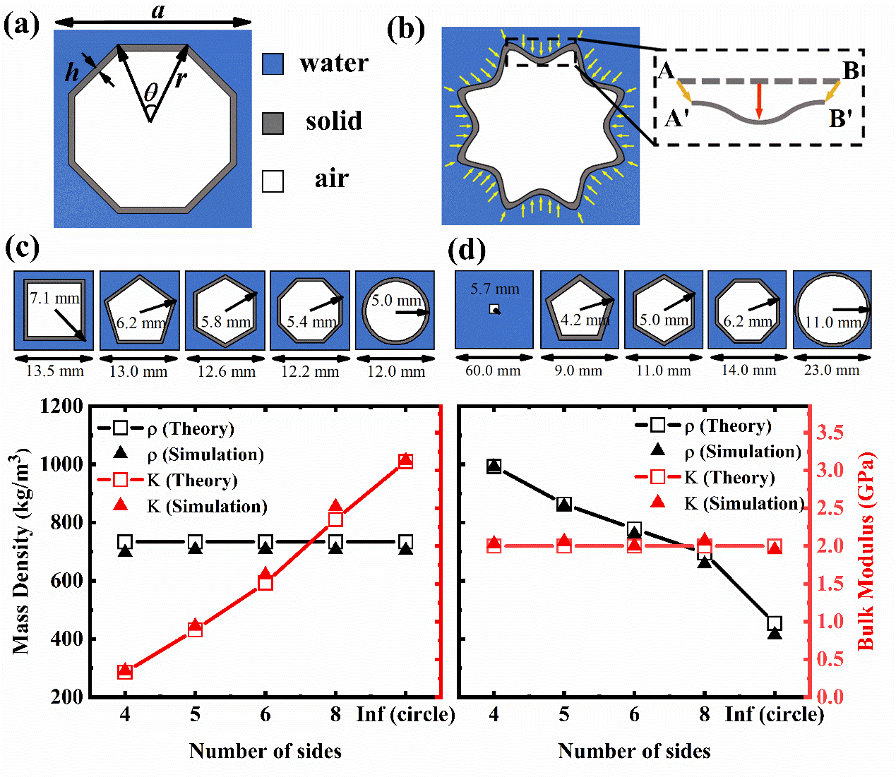 研究人员通过将空心正多边形结构周期排列在水中,构建了二维声学超流体。 借助有效介质理论,声学超流体的等效质量可表示为各组分的平均质量,其等效模量则取决于背景介质和空心正多边形在均匀负载下的截面形变。根据得到的声学参数表达式,声学超流体的质量密度和体积模量可以被快速和准确地进行调控。研究人员进一步设计了两组不同几何构型和材质的声学超流体,验证了其对质量密度和体积模量的独立调控能力。在此基础上,研究人员利用该声学超流体设计和实现了阻抗匹配型的水下梯度透镜和水下声学隐身毯,并通过仿真和实验验证了其在宽频范围内的有效性。