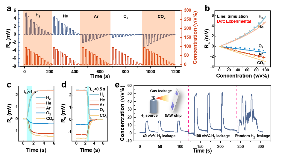 声表面波技术作为一种微纳尺度的声学MEMS器件技术,是气体传感技术的重要分支。王文研究团队提出了一种基于声阻抗效应的声表面波气体泄漏新机制,用气体负载产生的声阻抗变化来调制声表面波传播,实现了对气体泄漏的实时快速监测,且具备微尺度、低功耗等特点。试验结果显示,基于声阻抗效应的泄漏传感器成功实现了氢气、氦气、氩气、氧气、二氧化碳等气体的快速(T90<1s,T10<0.5s)与宽量程(0-100%vol)泄漏检测,同时该技术可实时动态地获取呼吸速率、深度以及呼吸状态等关键生理参数,在人体健康监测领域也具有良好的应用前景。