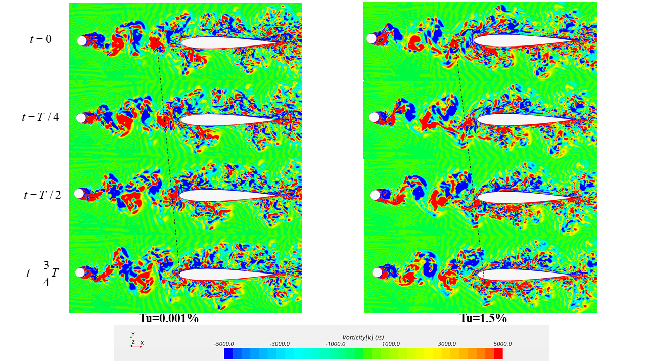 科研人员对计算域划分高质量结构网格,采用可压缩大涡模拟和声波传播方程混合方法,在确定计算域入口位置与圆柱相对翼型的实际偏移后,计算不同来流湍流度下柱-翼模型的流场分布和辐射噪声,并和公开实验数据进行对比验证了某一湍流度下计算结果的可靠性。通过对涡量场中涡结构演化进行分析,以及采用流场降阶方法 (POD, Proper Orthogonal Decomposition)方法对流场模态分布进行分析,探究来流湍流度对流场的影响,从而揭示其对辐射噪声的作用规律。