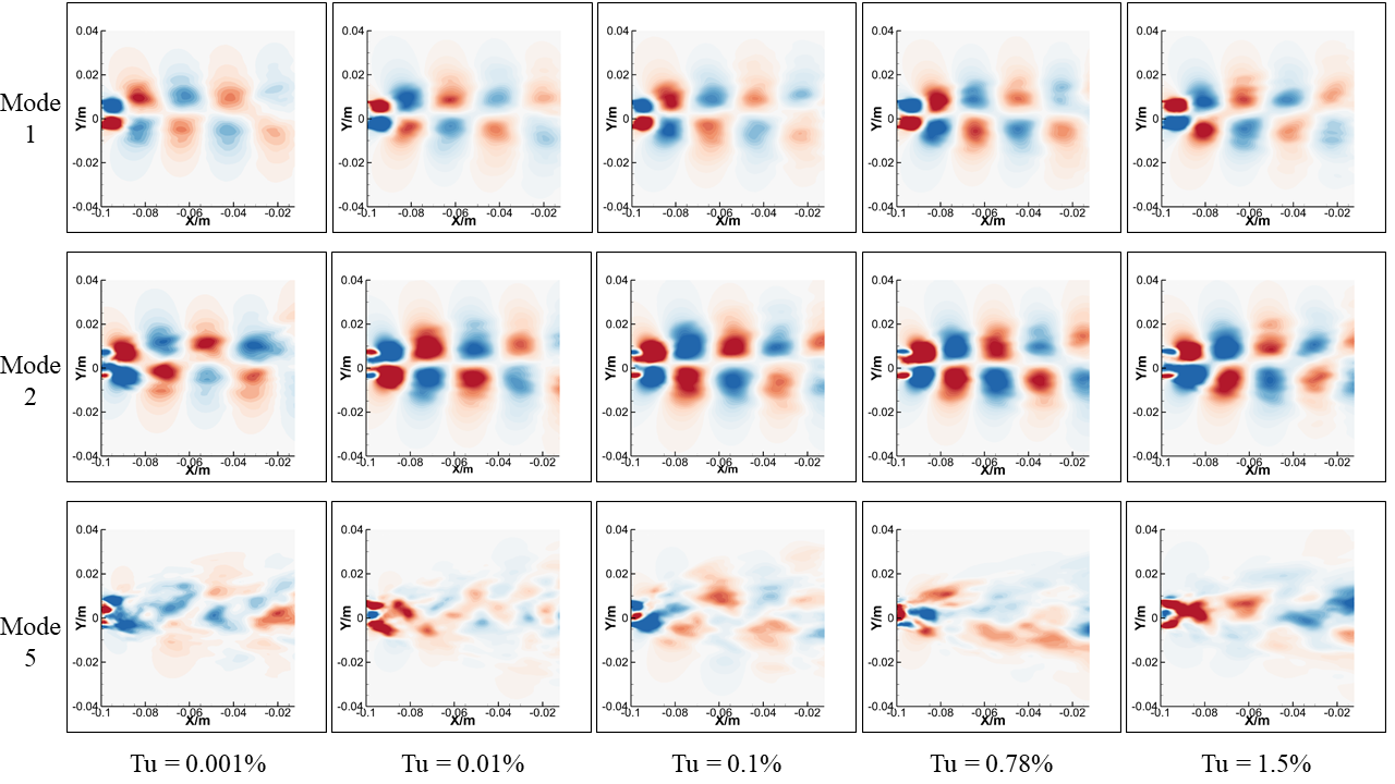 图2 不同湍流度下流向速度的第1、2、5阶POD模态云图(图/中国科学院声学研究所)