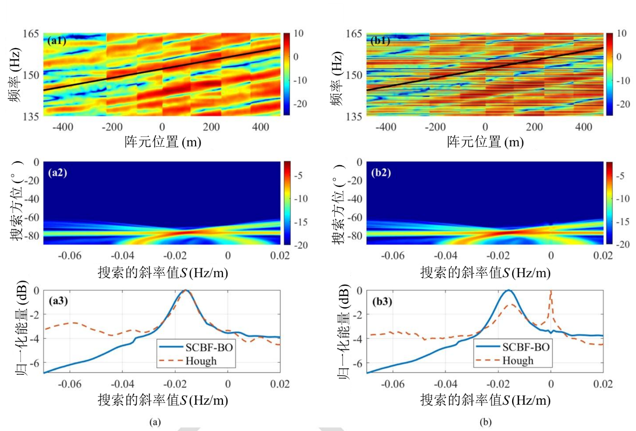 研究人员首先通过理论研究证明了SBF的波束会聚能力。基于简正波和频移补偿理论,推导得出SBF处理的沿条纹阵列信号相位关系近似与形成条纹的模态参数无关。此方法应用时存在声源频谱缓变要求和信号截断时间影响,且依赖外部图像处理获取条纹斜率信息。研究人员进一步提出SCBF-BO算法,该算法利用CBF波束输出(beam output, BO)与接收声压阵列信号互相关处理,消除声源相位谱和截断效应的影响,通过频移处理压制声源幅度谱的影响,同时保持波束输出的会聚能力。通过利用SCBF-BO主瓣位置与所用条纹斜率近似无关但输出增益与条纹斜率有关的物理性质,引入斜率搜索流程,使SCBF-BO方法摆脱了对外部图像处理获取斜率信息的依赖。