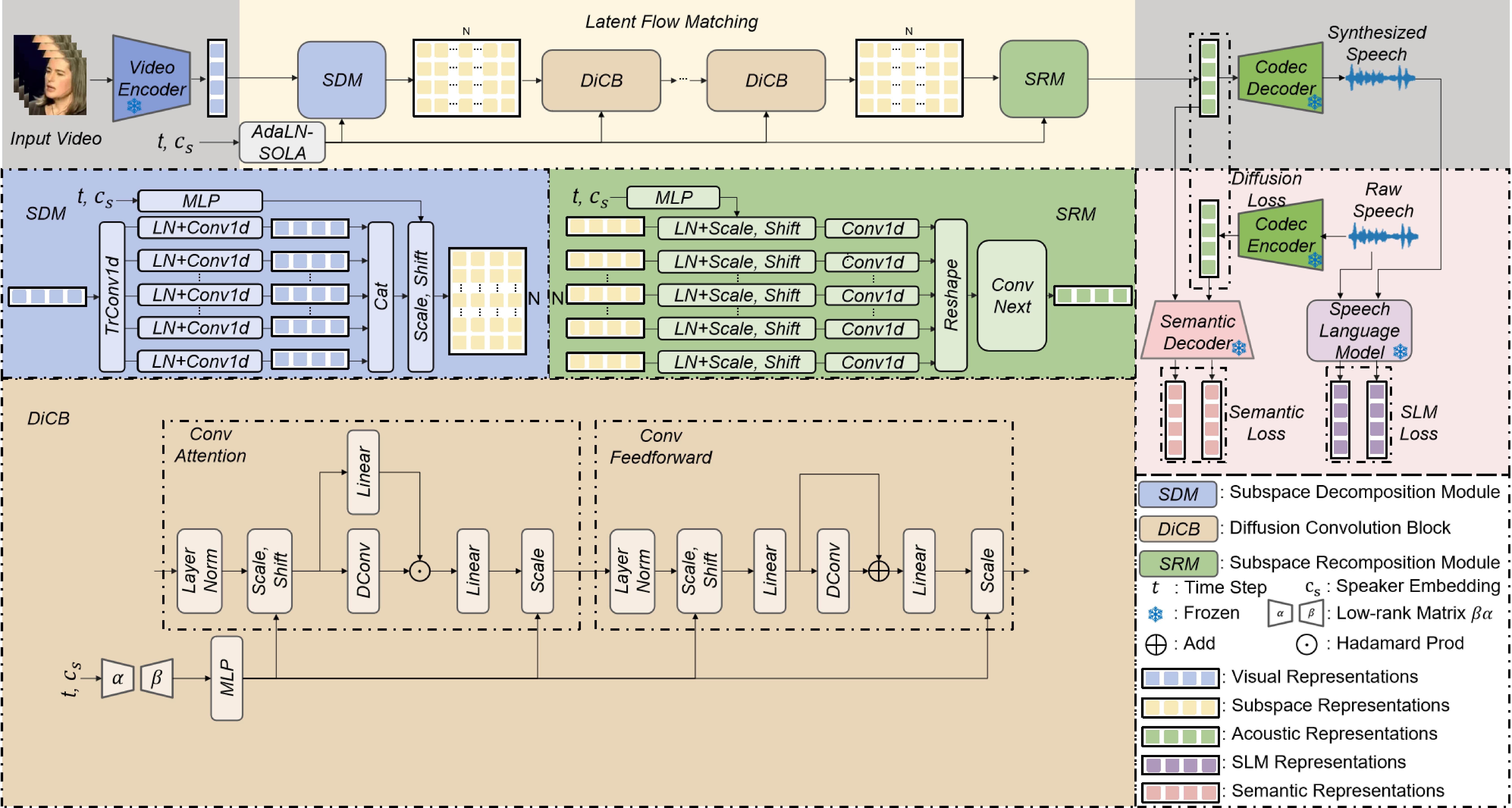 唇语语音合成(Lip-to-Speech)可直接从视觉唇动信号生成语音,在视频自动配音、无声通信、语音辅助等场景具有重要应用价值。现有方法常依赖梅尔谱或离散语义单元作为中间表征,前者易出现过平滑,后者会丢失细粒度声学细节,难以支撑高保真语音生成。为此,中国科学院声学研究所梁益帆博士生、特别研究助理李安冬及郑成诗研究员等提出分层子空间潜扩散框架SLD-L2S,摒弃传统声学表征,直接在连续潜空间中建立视觉唇动到神经音频编解码器隐变量的映射,有效避免量化误差与信息损失;同时采用子空间分解策略,将高维视觉特征解耦到多个平行子空间进行高效交互,更精准地建模跨模态时空依赖关系。此外,团队结合重参数化流匹配技术,引入语义一致性与语音语言模型双重辅助损失,在潜空间与波形层面同时约束生成过程。模型仅需10步推理即可完成高质量语音生成,在多项标准评测集上在取得了当前最优的合成语音质量。