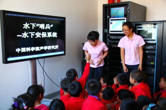 在一天的开放日中,水下“哨兵”吸引了近700名观众的驻足观看,既有幼儿园的小朋友,又有成年人。最多的还是大中小学生,他们当中既有乘车1个多小时专程赶来的农民工子弟小学的同学们,又有来自北大物理学院的莘莘学子。他们饶有兴趣地观看了介绍系统的视频资料,详细地倾听了讲解员对每一件实物成果的介绍。在互动环节中,小朋友们对水下喊话干扰器产生了浓厚的兴趣,这个新型设备具有两个功能:一是用于远距离的水下广播;二是发出刺激干扰音,对水下恐怖分子发起攻击,使其感到不适,被迫浮出水面。当小朋友们发现自己的歌声,可以在很远距离的水下传出来时,都兴奋地尖叫起来。