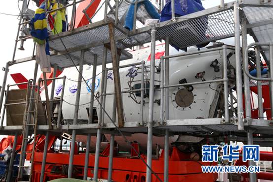 这是6月3日拍摄的“蛟龙”号载人潜水器。当日上午,搭载着我国“蛟龙”号载人潜水器的“向阳红09”试验母船从江苏江阴苏南码头启航,奔赴马里亚纳海沟区域执行“蛟龙”号7000米级海试任务。