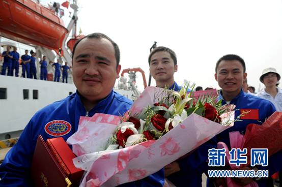 6月3日,三名潜航员在起航仪式上整装待发。当日上午,搭载着我国“蛟龙”号载人潜水器的“向阳红09”试验母船从江苏江阴苏南码头启航,奔赴马里亚纳海沟区域执行“蛟龙”号7000米级海试任务。