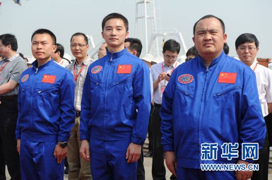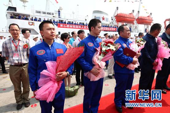 6月3日,三位“蛟龙”号潜航员在启航仪式上。当日上午,搭载着我国“蛟龙”号载人潜水器的“向阳红09”试验母船从江苏江阴苏南码头启航,奔赴马里亚纳海沟区域执行“蛟龙”号7000米级海试任务。