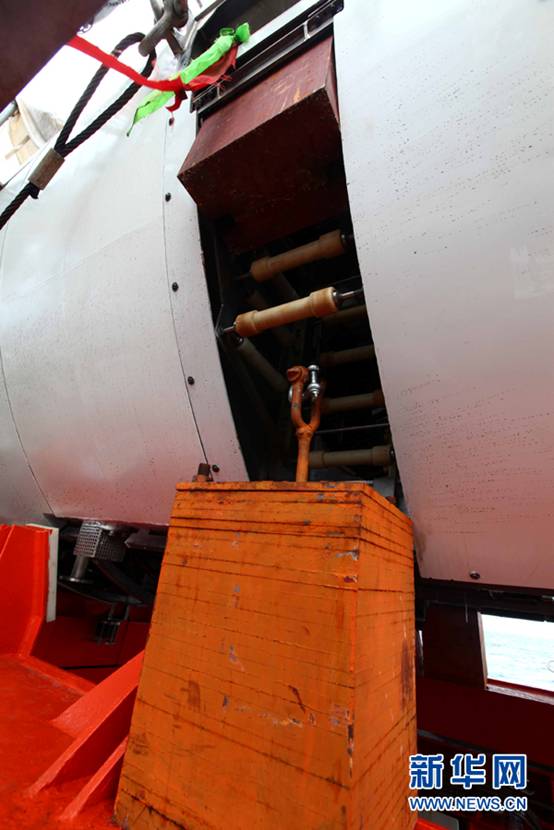 “蛟龙”号上安装的采样设备(6月14日摄)。当日,“蛟龙”号7000米级海试团队为潜水器安装上压载铁、采样篮等各种下潜所需的设备,为6月15日第一次下潜试验做好准备。受今年第四号热带风暴“古超”影响,试验海域海况仍然无法满足潜水器下潜条件,原定于6月14日进行的第一次下潜试验推迟至15日进行。新华社记者罗沙摄