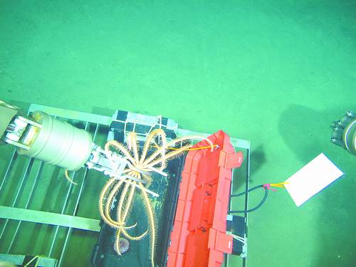 深蓝色海水掀起一座座浪峰,每一次吞吐,一颗鲜红的“明珠”就跃出几许。这“明珠”时隐时现,身手矫捷的蛙人乘船而至,把它用一根缆绳牢牢牵住。