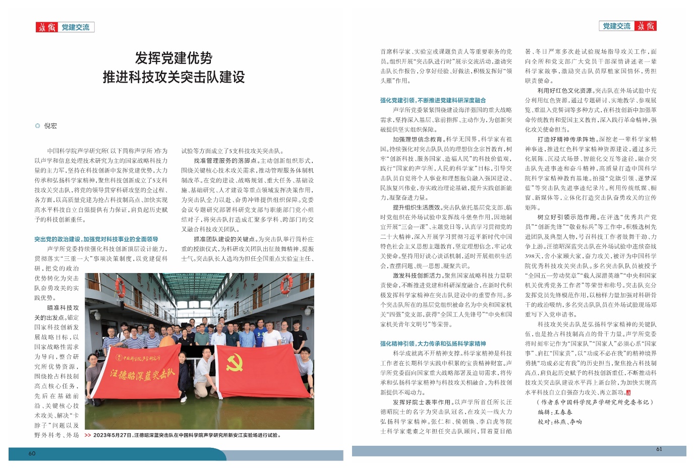 中国科学院声学研究所(以下简称声学所)作为以声学和信息处理技术研究为主的国家战略科技力量的主力军,坚持在科技创新中发挥党建优势,大力传承和弘扬科学家精神,聚焦科技创新成立了5支科技攻关突击队,将党的领导贯穿科研攻坚的全过程、各方面,以高质量党建为抢占科技制高点、加快实现高水平科技自立自强提供有力保证,肩负起历史赋予的科技创新重任。