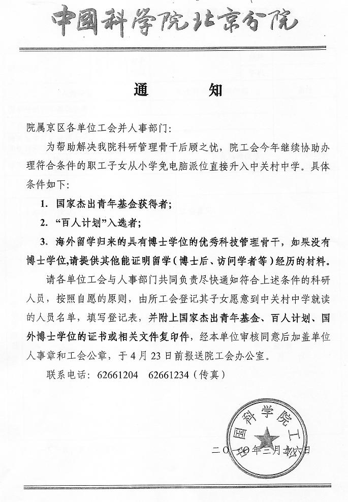 为帮助解决科研管理骨干后顾之忧,院工会今年继续协助办理符合条件的职工子女从小学免电脑派位直接升入中关村中学。