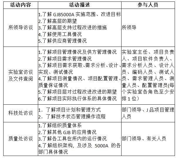 由于调研活动是深入了解我所软件开发及管理过程的一个重要切入点,是后续GJB5000A认证工作的基础,将为制定下一步过程改进实施计划起重要的导引作用,所以请各有关部门高度重视,安排好人员,准备好相关文件,按计划的时间、地点参加访谈活动。