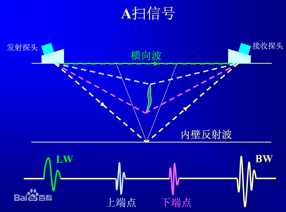 超声波探伤法是工业无损检测(不破坏材料)的一种方法,就广义而言,不仅可以对金属或非金属材料的缺陷(内部的和表面的)进行探测,还可对材料的厚度(如锅炉壁厚)、强度(如混凝土及塑料强度)和高度(如液面高度)等参量进行检测。之所以能够探伤,主要是利用了超声波的传播能量大、方向性好及在不同介质的界面上具有反射特性。超声波探伤具有灵敏度高、穿透力强、效率高、成本低、对人体无害的优点。
