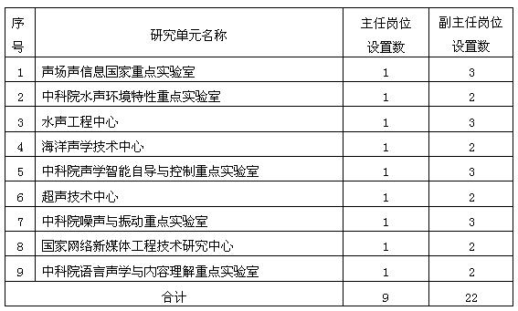 为贯彻落实中国科学院“率先行动计划”要求,推进海洋信息技术创新研究院筹建工作,依据《中国科学院海洋信息技术创新研究院实施方案》、《中国科学院声学研究所机构改革方案》、《关于中国科学院研究所中层干部选拨聘用与管理的指导意见》(科发党字 [2010] 28号)和《中国科学院声学研究所岗位管理实施办法》(声人字 [2013] 40号),本着“按需设岗,按岗聘任,竞争择优”和“公开、公平、公正”的原则,开展声学所本部研究单元负责人岗位竞聘工作,公开招聘各研究单元负责人。