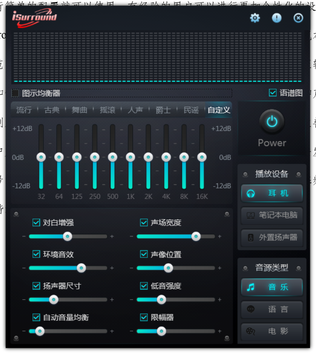 iSurround音效软件是专门为个人电脑打造的Windows平台音效增强套件。它是利用两只扬声器或一副立体声耳机来制造出逼真的环绕立体声体验,以营造真实自然的空间声场,改善聆听感受。iSurround的主要功能包括对白增强、声场扩展、环境音效、声像位置调整、动态范围控制、低音增强和语谱分析等等。针对不同的播放设备(耳机、笔记本扬声器、外置扬声器)和不同的音源类型(音乐、语言、电影)进行了个性化的性能优化和音效配置,一般用户只要对这两个选项进行简单的配置就可以使用,有经验的用户可以进行更加个性化的设置。软件界面如下图所示。