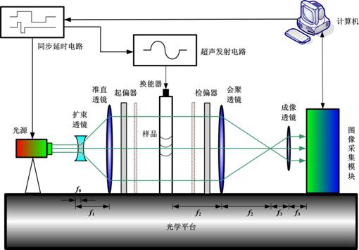 光路中的起偏器和检偏器是一对偏振方向相互垂直的偏振片,当高电压信号激励换能器向下辐射超声波时,通过样品的平行光的偏振方向会因固体的暂时双折射效应而发生改变,从而拍摄到明亮的超声波波前。虚线所示部分为一对圆偏振片,它们的快轴(慢轴)相互正交,且与起偏器和检偏器的偏振轴均成45°角,使得光弹图像中的光强分布仅与样品的内应力大小有关,与应力方向无关。此外,同步延时电路控制激光和超声之间的相对延时,通过改变超声波在样品中的传播距离,从而令观察者看到在固体中传播、散射的声场图像。