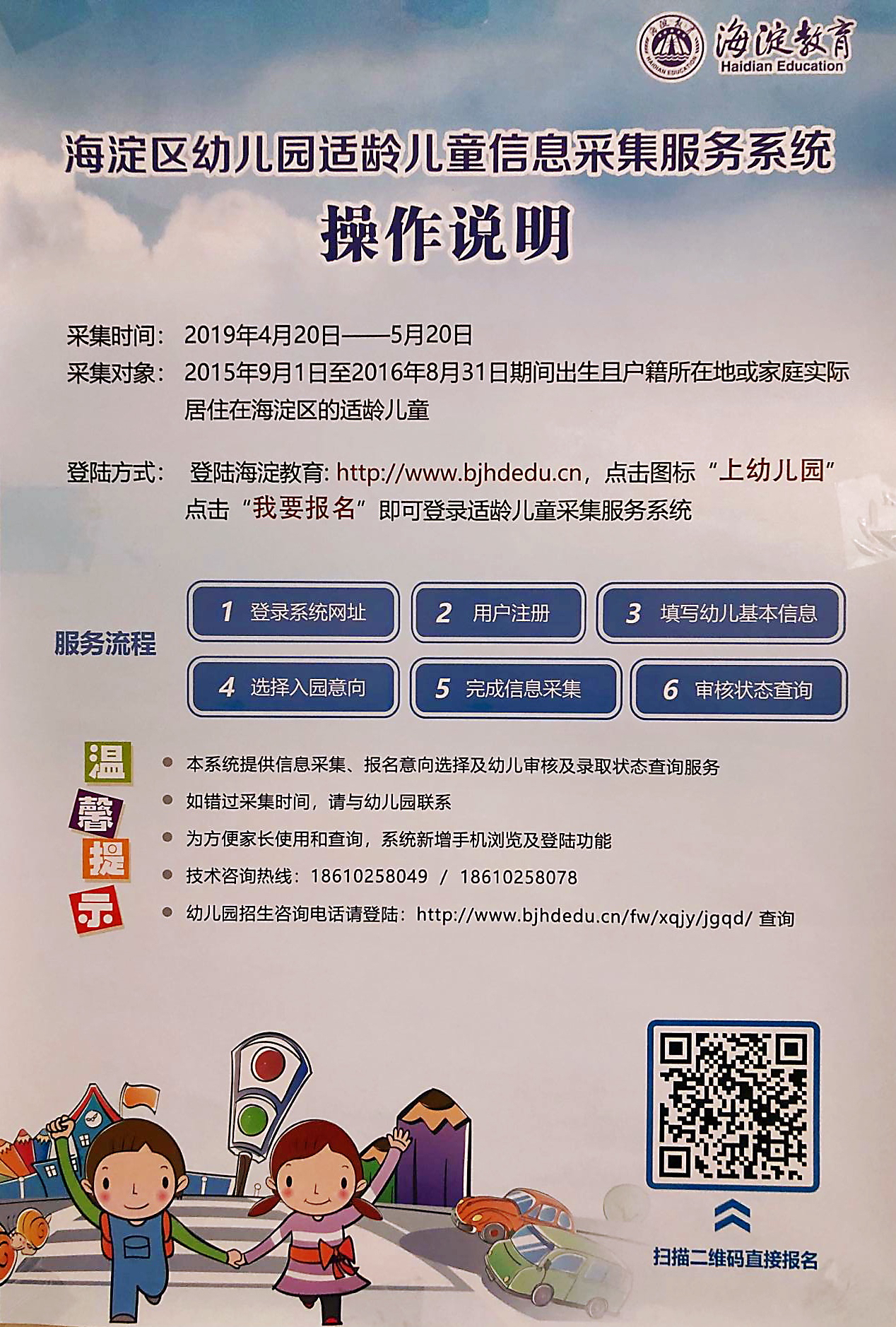 1. 2019年4月20日---5月20日,海淀区域园所采集报名信息(具体操作参见附件:2019年海淀区幼儿园适龄儿童信息采集服务系统操作说明。注意:报名选择三幼小班部1的,报名园所请填写中国科学院幼儿园;报名选择三幼小班部2的,报名园所请填写中国科学院第三幼儿园)。