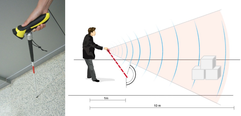 超声波导盲仪是中国科学院声学研究所利用超声回波定位原理开发的科技助残设备。超声导盲仪通过发射超声波,接收障碍物反射的回波,经过处理后,将障碍物的距离信息转化为声音信息,以可听声的形式反馈给使用者,达到“以听代视”的效果。该设备的特点是:探测距离远,分辨率高,盲人可利用系统感知障碍物的方向、形状、距离和材质等信息;操作简单,而且可以和普通盲杖相连配合使用,辅助盲人出行。
