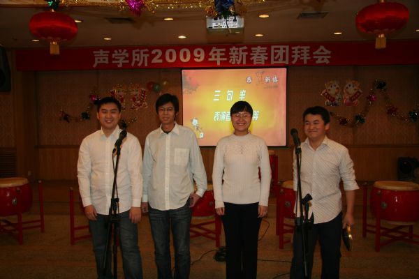 1月16日下午,声学所在DSP四层多功能厅成功举办了隆重而盛大的2009年新春团拜会,精彩的节目、趣味的游戏、丰富的礼品,精彩纷呈,令人目不暇接,多功能厅处处弥漫着欢声笑语,沉浸在节日的喜庆氛围中。声学所副所长张春华、潘锋,副书记王小民,所长助理黄正、颜永红,职代会主席倪宏等领导出席了团拜会。