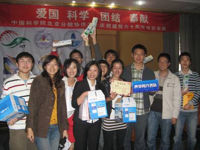 2009年10月29日下午2点,由中国科学院北京分院协作二片团委主办的“庆祝中国科学院建院六十周年知识竞赛”在力学所小礼堂隆重举行。此次活动由声学所团委、理化所团委、电工所团委、化学所团委、力学所团委承办,在各所领导的高度重视和得力组织下,顺利、有序、热烈的开展。本次知识竞赛以“爱国、科学、团结、奉献”为主题,以增加协作二片师生的爱国情怀与交流,增强科研创新凝聚力和战斗力,营造健康、向上、和谐的研究文化氛围为目的,立意鲜明,意义深远。声学所党委副书记、副所长倪宏,办公室副主任发强出席了这次活动。声学所参赛队由团委书记张云鹏带队,三位参赛选手准备充分,严谨认真,精神饱满,他们在比赛中团结协作,机敏果断,展现了我所教职工及同学良好的精神风貌,最终在众所中脱颖而出,取得了三等奖的好成绩。