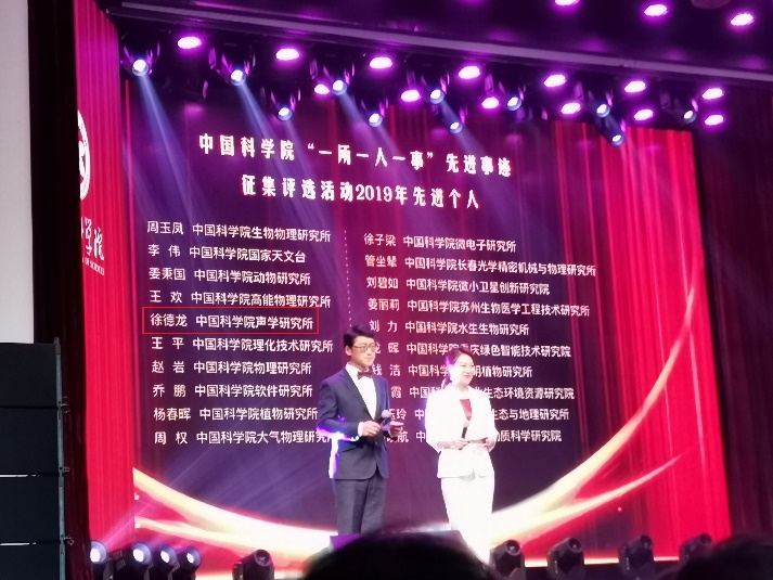 会上,对中国科学院在2019年开展“一所一人一事”先进事迹征集评选活动中的优秀组织单位和先进个人进行了表彰。声学所再次荣获优秀组织单位荣誉称号,超声技术中心徐德龙同志荣获先进个人荣誉称号。