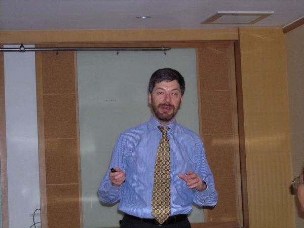 Gurevich教授的报告题为“ Modelling Attenuation and Dispersion of Elastic Waves in Porous Rocks due to Wave Induced Fluid Flow”。他指出,在孔隙多相介质中,声波的扰动可导致孔隙流体的运动(波致流),进一步引起粘性耗散,从而导致弹性波衰减和散射。波致流引起的弹性波衰减和散射一直以来都是世界性的难题,Gurevich教授分析了以往方法和模型的优缺点,在前人工作的基础上发展了自己的模型和方法。例如,他指出在分析介观(介于微观和宏观之间)流对弹性波的影响时,可应用统计波传播的理论分析声场的动力学特征,将统计平滑的方法应用到Biot孔隙弹性介质模型中,得到波致流影响下的声场,从而可用于分析波致流引起的弹性波的衰减和散射;而在分析喷射流的作用时,他通过分析分布在岩石颗粒间孔隙的特点,应用孔隙弹性声学理论,得到了喷射流模型,这一模型的结果与前人(如Gassmann’s 和Mavko-Jizba等)的结果相比,具有很好的一致性。