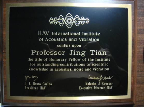 2010年7月18日至22日,第17届国际声与振动大会(ICSV17)在埃及的开罗举行,会议期间,国际声学和振动学会(IIAV)宣布授予中国声学学会理事长、中国科学院声学研究所研究员田静博士学会荣誉会士(Honorary Fellow)称号,并颁发了证书和奖牌,以表彰其在声学和振动研究领域中所做出的杰出贡献。该证书由国际声学和振动学会理事长Luis Bento Coelho和执行理事长Malcolm J. Crocker共同签署。