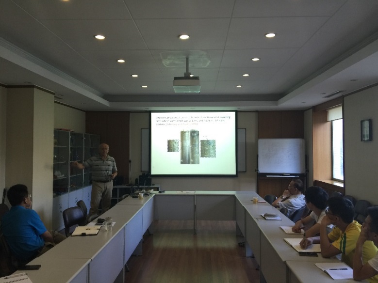 同时,Boris Katsnelson教授给研究生开设了为期四天的”Shallow water acoustics”的系列课程讲座,四天的讲座内容包括 “Shallow water acoustics. Statement of the problem, general description of sound propagation”、 “Internal waves in shallow water. Sound propagation in the presence of internal waves. Mode coupling and horizontal refraction”、 “Noise in shallow water. Spectrum, correlation function” and “Geoacoustic inversion, statement of the problem, methods, and several results”。Boris Katsnelson教授耐心细致地为研究生们讲解了浅海声学基本概论、内波存在下的声传播、模态耦合和水平折射,浅海噪声谱和相关函数,声学参数反演问题的方法和结果等基础理论知识。