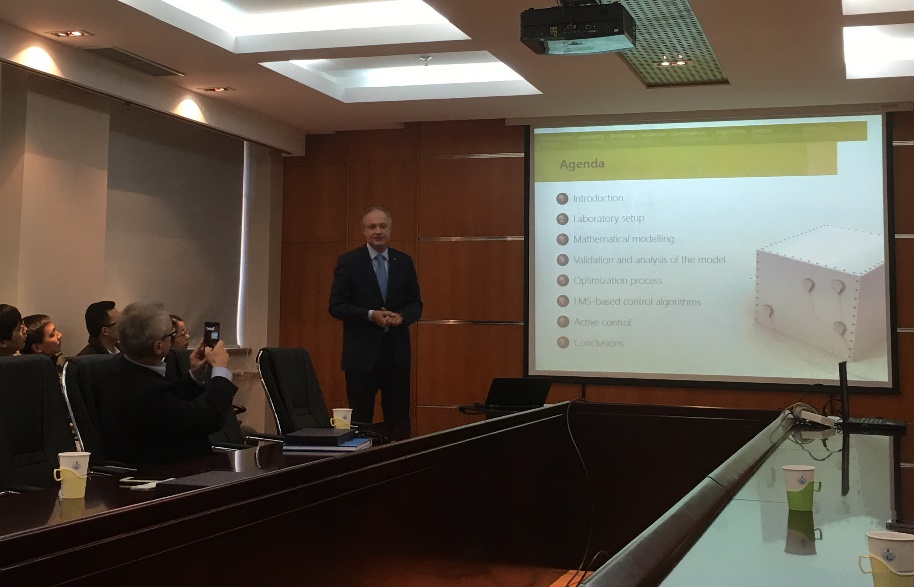 ArkadiuszMężyk教授和MarekPawełczyk教授是国际上著名的机械振动及声学专家,此次访问期间,他们分别做了作了题为“Optimizing dynamic characteristics of mining machines”和“Active reduction of device acoustic noise by controlling vibration of the device casing”的学术报告。声学所的师生与两位教授进行了深入的交流。其中杨军主任介绍了实验室的相关研究工作,并陪同两位教授参观了相关实验室。
