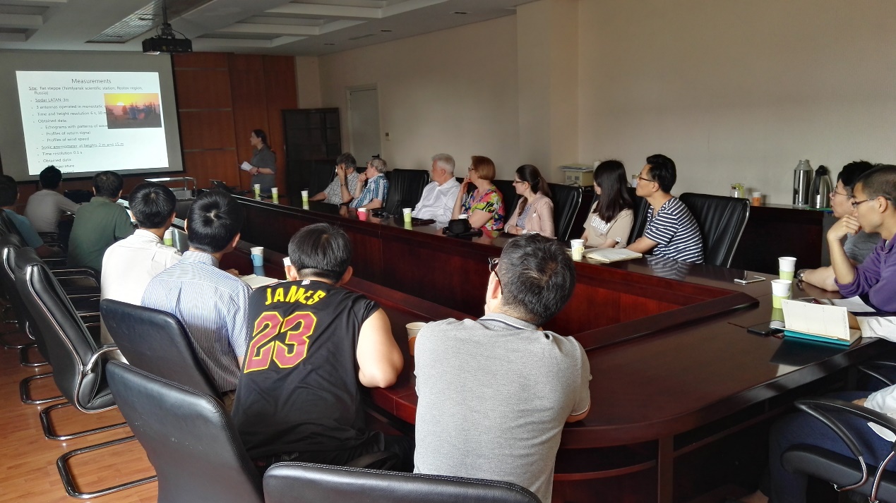 此次访问期间,俄方专家Igor Chunchuzov和Vitalii Pereplkin两位高级研究员与院噪声与振动重点实验室次声学课题组在次声波与地震的关联性、泥石流次声信号特征分析与识别、次声波远距离传播对次声信号的影响等关键技术进行了深入的研讨,这为次声学课题组相关课题的研究提供了技术帮助。5月8日,Daria Zaitseva博士在声学所内作了题为“基于声雷达探测大气内重力波对稳定大气边界层湍流的影响”的学术报告,展示了俄方在利用声雷达技术探测大气边界层方面的研究成果。此后,院噪声与振动重点实验室杨军主任作了报告,向俄方人员详细介绍了声学所和院噪声与振动重点实验室的研究方向以及近年来的重要研究成果,引起了俄罗斯专家的浓厚兴趣。此次报告会引起了国内外相关研究机构的广泛关注,除了声学所的研究人员和学生外,参加此次报告会还包括中科院大气物理所、武汉大学等多家单位在内的研究人员和学生参加。