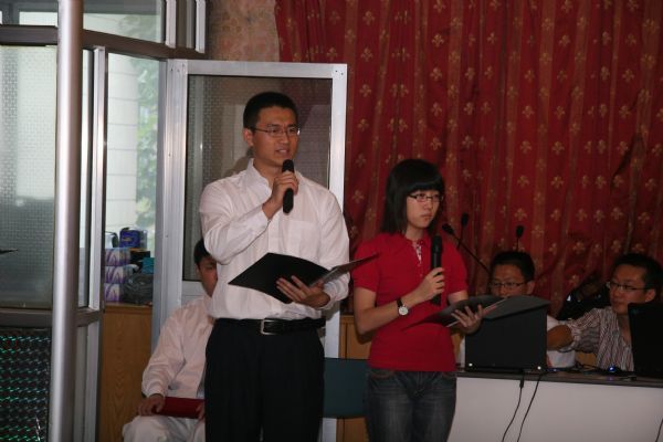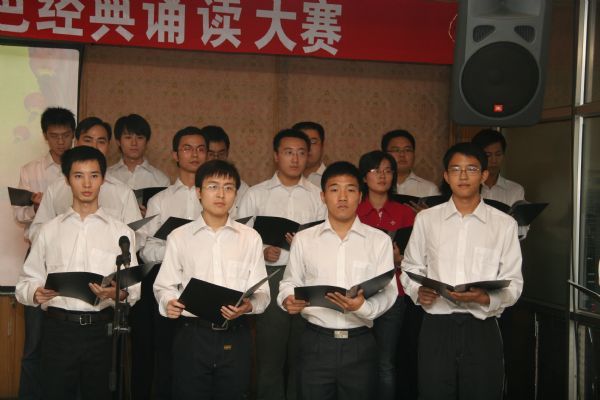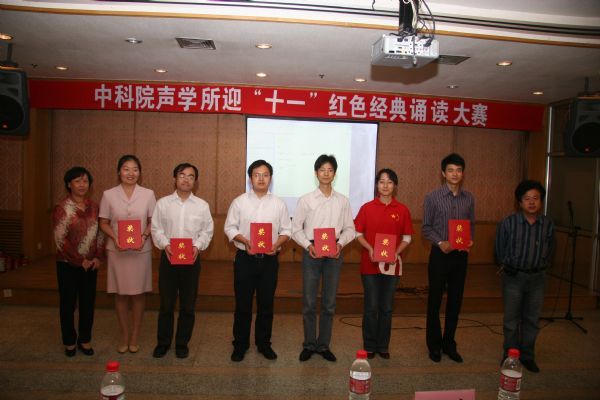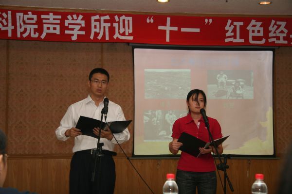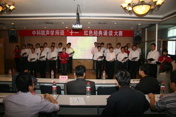 在得知声学所举办祖国六十华诞诗歌朗诵比赛的决定后,实验室领导立即给予了极大的关切和支持。为了让更多的同学接受爱国主义教育,实验室号召全体同学踊跃报名。于是,一支由36名成员组成的空前庞大队伍成立了。