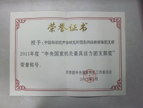 为加强团的基层组织建设,以改革创新精神做好新时期机关共青团工作,全面推进《中央国家机关青年干部成长计划》的落实,中央国家机关团工委决定设立并评选2011年度“共青团工作奖”和“最具活力团支部奖”,共评选20个基层团支部获得了2011年“最具活力团支部”奖,中国科学院内仅我所网络新媒体团支部获此殊荣。