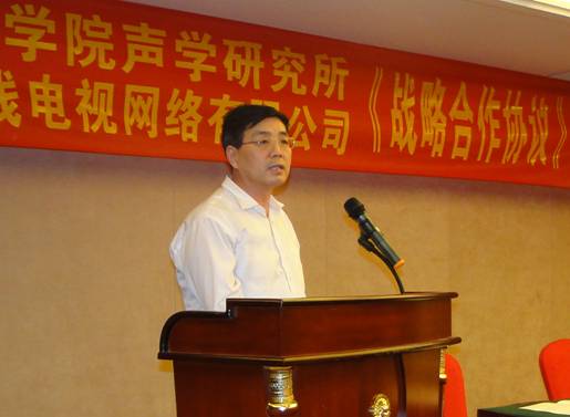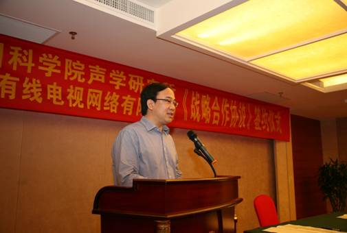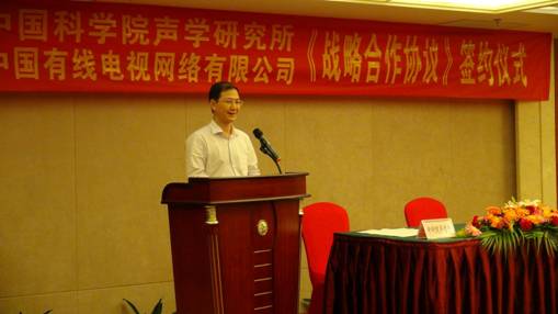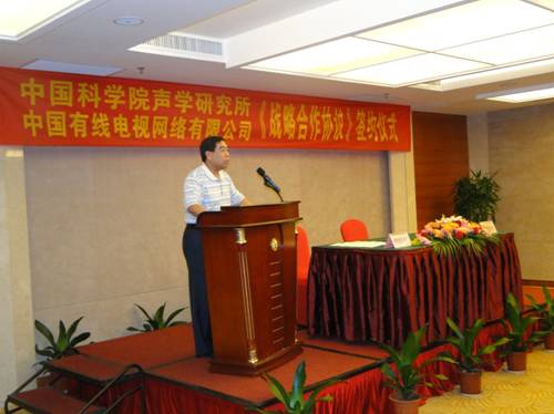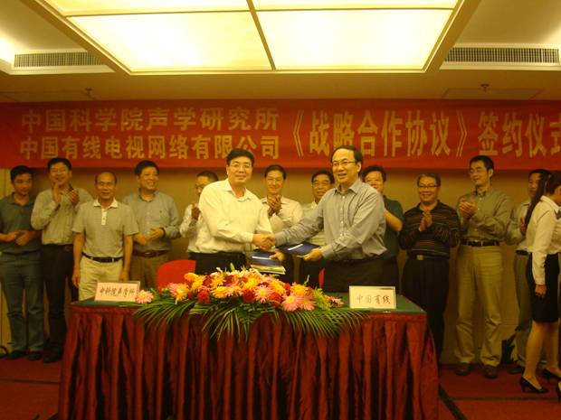 2012年12月21日下午,中国科学院声学研究所与中国有线电视网络有限公司在海南省海口市签订了《战略合作协议》。中国科学院声学研究所王小民所长和中国有线电视网络有限公司沈向军副董事长、总经理作为签约人签约,海南省科技厅副厅长王利生、文体厅巡视员王炳林,中国科学院声学研究所国家网络新媒体工程研究中心主任王劲林、科技处处长高军保、南海研究站站长戴琼兴,中国有线电视网络有限公司副总经理李戈、副总工程师彭劲、海南分公司总经理朱卫平,海南大学信息学院院长助理杜锋教授等7个单位30余人出席了签约仪式,签约仪式由中科院声学研究所副所长、党委副书记倪宏主持。