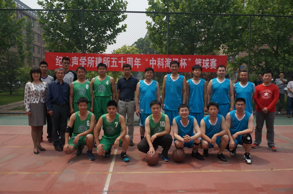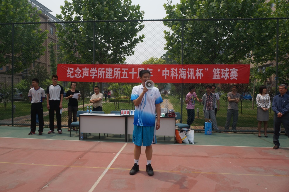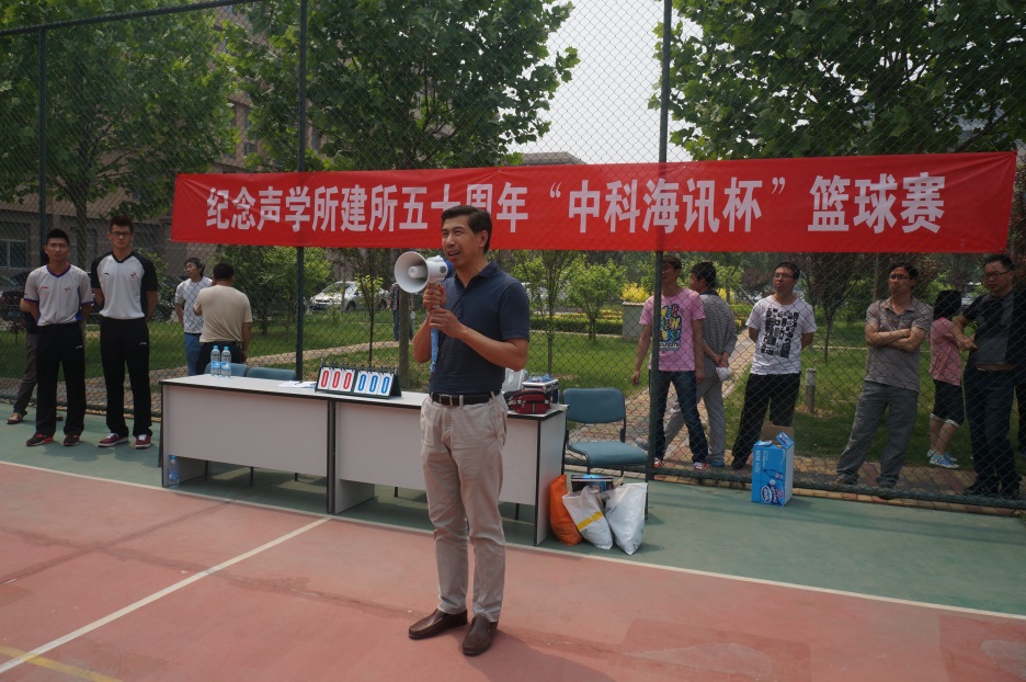 2014年5月19日中午阳光明媚,一年一度的声学所“中科海讯杯”篮球赛在声学所篮球场开幕。“中科海讯杯”篮球赛是声学所的招牌性赛事,今年又恰逢声学所建所五十周年,全所篮球爱好者积极踊跃报名参赛,都希望在本次比赛中取得优异的成绩。