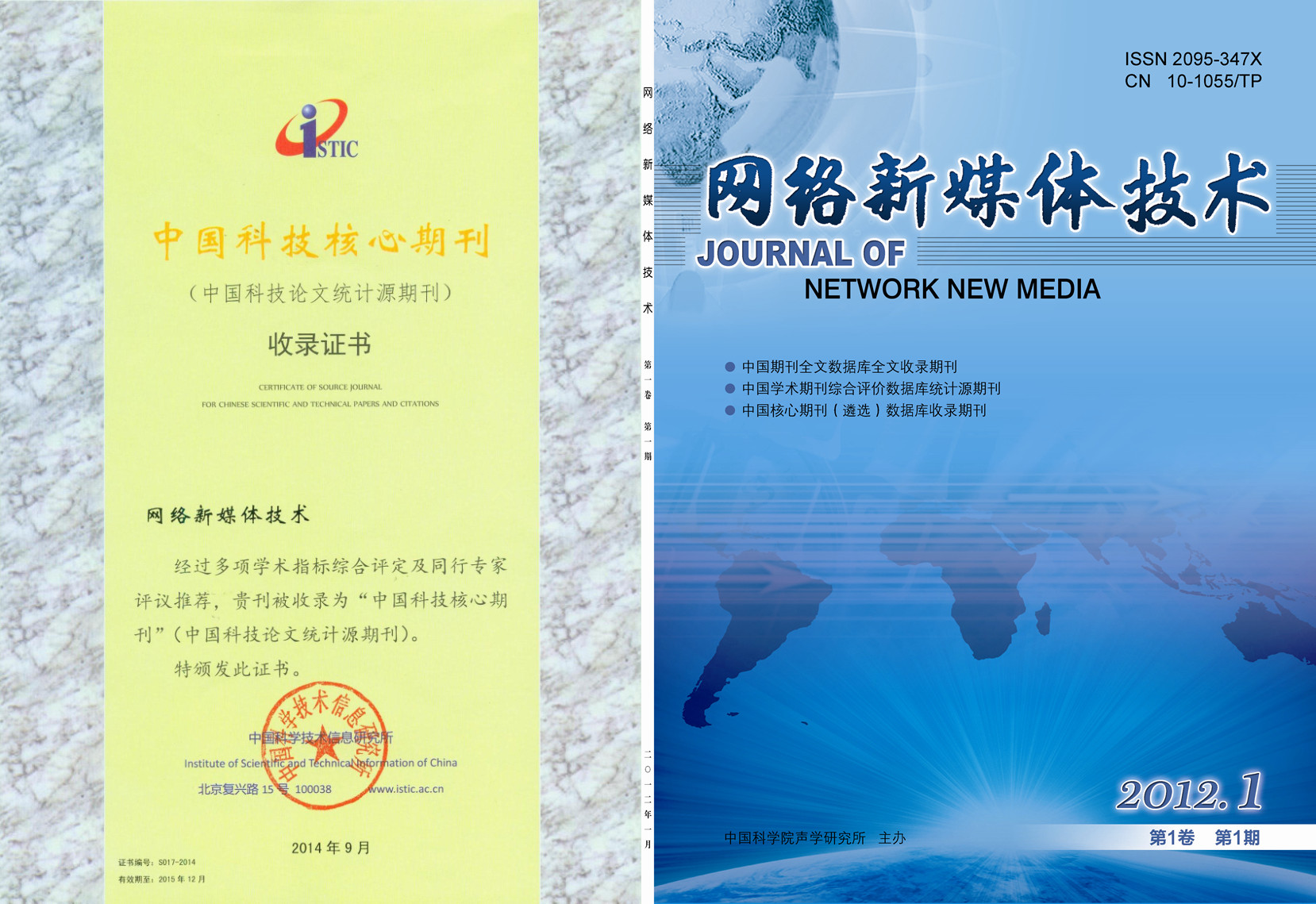2014年9月26日,由科技部中国科学技术信息研究所主办的中国科技论文统计结果发布会在北京国际会议中心隆重召开,会上揭晓了“中国科技核心期刊”的评选结果。由我所主办,以国家网络新媒体工程技术研究中心为依托的《网络新媒体技术》期刊,通过了多项学术指标综合评定及同行专家评议推荐,被收录为中国科技核心期刊(中国科技论文统计源期刊)。此次新入选中国科技核心期刊的中文期刊有32个,英文期刊有3个,淘汰45个,预警202个。《网络新媒体技术》期刊是唯一一个新入选的计算机科学技术类的期刊。
