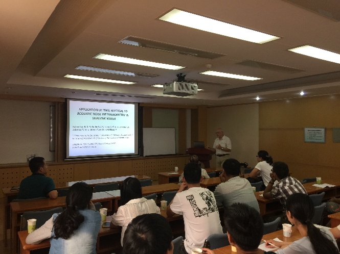 同时,Boris Katsnelson教授给研究生开设了为期四天的”Shallow water acoustics”的系列课程讲座,四天的讲座内容包括 “Shallow water acoustics. Statement of the problem, general description of sound propagation”、 “Internal waves in shallow water. Sound propagation in the presence of internal waves. Mode coupling and horizontal refraction”、 “Noise in shallow water. Spectrum, correlation function” and “Geoacoustic inversion, statement of the problem, methods, and several results”。Boris Katsnelson教授耐心细致地为研究生们讲解了浅海声学基本概论、内波存在下的声传播、模态耦合和水平折射,浅海噪声谱和相关函数,声学参数反演问题的方法和结果等基础理论知识。