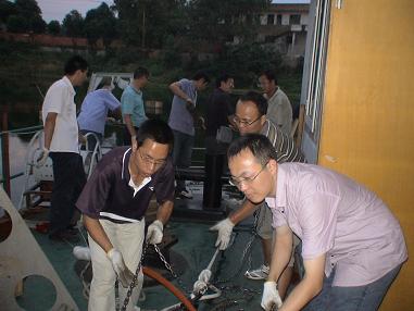 试验初期,由于试验场地的条件限制,大型设备无法迁运到湖中,试验无法顺利进行。同事们根据地况集思广益,最后想出了解决的办法,通过人工拉链将设备放置在平板船上由湖岸拉到湖中,此项工作从试验初期一直坚持到试验结束。同样,到试验区域的同事也要像拉设备一样每天通过人力拉到终点,返回亦是如此。此项工作,他们一直坚持到最后,以至于先期由众人拉船娴熟到个人进行,大家还笑称:神龙摆首不摆尾。