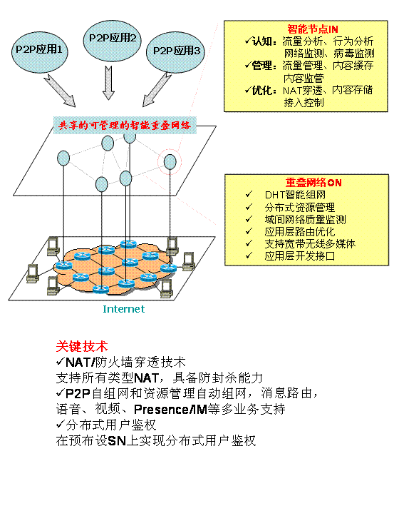 研发支持IPv6的P2P SIP的核心网关设备,并利用该网关设备在P2P弹性重叠网上搭建可运营可管理的VoIP业务平台,支持IAD、SIP Phone、移动WiFi Phone、Soft Phone等多种终端的接入,具有PC2Phone、Internet Voice、Conference、Instant Message、Presence等增值功能;充分利用自动组网和DHT技术提高该平台的易操作性、可扩展性和健壮性,降低该平台的运维成本;并通过网络测量、路由优化、数据转发等技术保障视音频服务的QoS;通过对标准SoftSwitch和TG等设备的支持,实现与传统电信网络或其他SIP系统的互通。