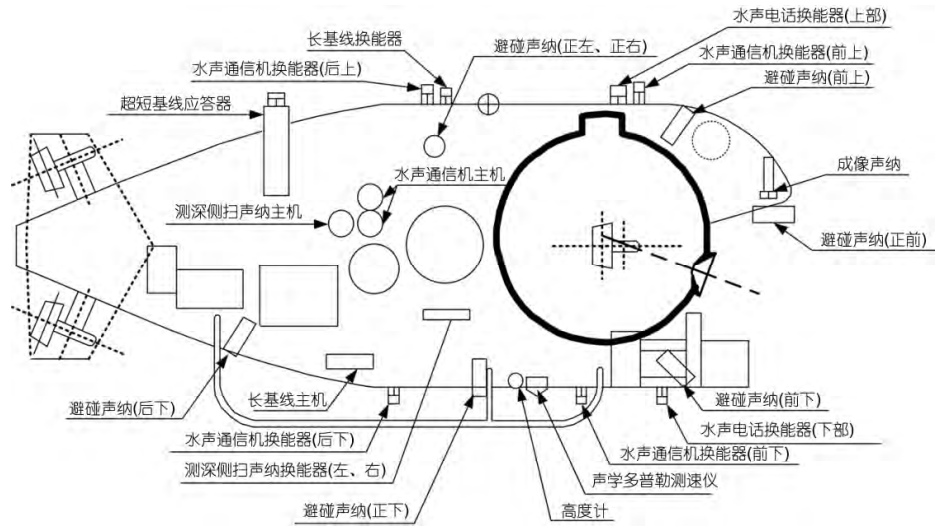 “蛟龙”号载人潜水器声学系统总体布置图(图片来源:作者提供)