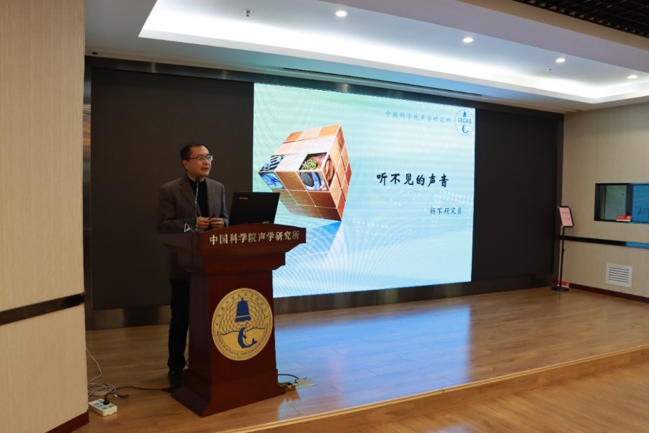 20211015日,中关村中学2021级“国科大科学实验班”授牌暨开课仪式在声学所举行,声学所副所长杨军应邀作科普报告。杨军团队自2016年起连续承担声学所与中关村中学合作的“国科大科学实验班”声信号小组的辅导工作,多次获结题答辩“优秀”的好成绩。