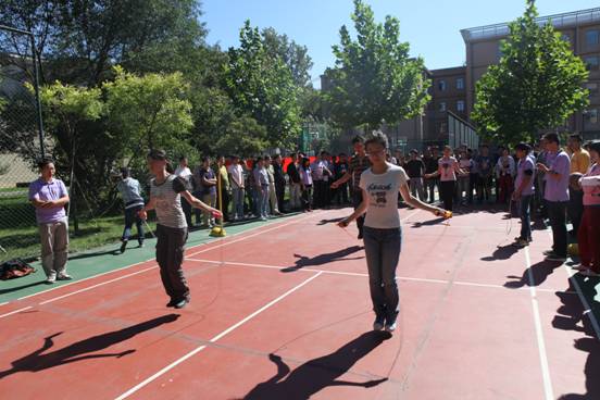 比赛在隆重热烈的开幕式后拉开了帷幕。比赛共有插红旗接力、单人跳绳、双人背对背夹球和双人定点投篮四个项目,每个项目都在工作人员的主持下紧张有序的进行着。
