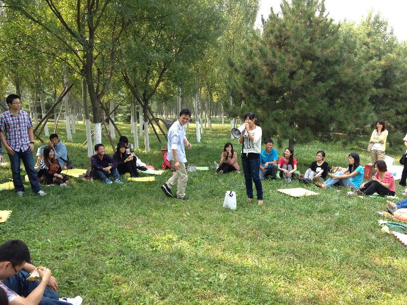 此次活动在空气清新,环境优美的北京奥林匹克公园举行,时值初秋的清晨,清凉的空气中夹杂着泥土的芳香,耳畔漂浮着鸟雀们清脆的鸣啼,缤纷多彩的野山菊成片成片地映入眼帘,美不胜收。在充满惬意的晨光中,我们的单身青年联谊活动在一片空旷的草地上拉开了帷幕。